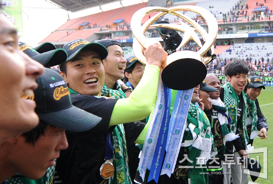 [전주=스포츠투데이 정재훈 기자] 전북 현대 모터스가 2011년 K리그 챔피언의 자리에 올랐다. 전북은 4일 오후 전주월드컵경기장에서 열린 '현대 오일뱅크 K리그 2011' 챔피언결정전 2차전에서 루이스의 결승골로 2:1 승리를 거두며 K리그 우승 트로피를 들어올렸다. 스포츠투데이 정재훈 사진기자 roze@<ⓒ아시아경제 & 재밌는 뉴스, 즐거운 하루 "스포츠투데이(stoo.com)">