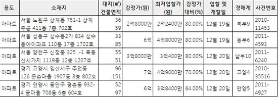 ◇서울 노원구 상계동 상계주공아파트, 최저가 2억2400만원=노원구 상계동 751-1 상계주공아파트 411동 702호가 경매가 진행된다. 1988년 준공된 17개동 2,136가구의 대단지로써 해당 물건은 15층 건물중의 7층으로 건물면적은 59.3㎡다. 4호선 7호선 노원역이 걸어서 10여분 거리다. 노해근린공원, 양지근린공원, 삿갓봉근린공원, 롯데백화점, 롯데마트, 홈플러스, 상계백병원 등이 인근에 있다. 상수초교, 을지초교, 당현초교, 신상중, 상계중, 노원중, 대진여고, 상명고, 서라벌고 등의 교육시설도 가까이 있다. 최초감정가 2억8000만원에서 한차례 유찰됐다. 경매 최저매각가는 2억2400만원으로 정해졌다. 입찰은 오는 19일 서울북부지방법원 경매9계. 사건번호 2010-11453.◇서울 성동구 성수동2가 현대아이파크, 최저가 4억8000만원=성동구 성수동2가 834 현대아이파크 아파트 110동 1702호가 경매에 나왔다. 2003년 준공된 11개동 656가구의 단지로 해당 물건은 25층 건물중의 17층이다. 건물면적은 85㎡다. 2호선 성수역이 걸어서 7분 거리며 주변에는 서울숲공원, 어린이대공원, 성삼공원, 햇님공원, 이마트 등이 있다. 경동초교, 경일초교, 경수중, 성원중, 경일고, 성수고, 건국대 등의 학교도 인근에 위치했다. 최초감정가 6억원에서 한차례 유찰돼 이번 경매 최저매각가는 4억8000만원이다. 입찰은 오는 19일 서울동부지방법원 경매6계에서 진행된다. 사건번호 2011-4593.◇서울 양천구 신정동 목동신시가지 11단지아파트, 최저가 3억400만원=양천구 신정동 325 목동신시가지 11단지아파트 1119동 1207호가 입찰자를 기다린다. 1988년 준공된 19개동 1,595가구의 대단지로 해당 물건은 15층 건물중의 12층이다. 건물면적 51.5㎡의 소형아파트다. 2호선 양천구청역이 걸어서 8분 거리며 계남근린공원, 신트리공원, 양명공원, 양천공원, 현대백화점, 이마트, 목동한방병원, 남부지방법원 등의 생활시설이 가까이 있다. 남명초교, 신기초교, 계남초교, 신서중, 신남중, 목동고, 신목고 등의 학교가 인근에 있다. 최초감정가 3억8000만 원에서 한차례 유찰됐고 이번 경매 최저매각가는 3억400만원으로 설정됐다. 입찰은 오는 20일 서울남부지방법원 경매10계에서 진행된다. 사건번호 2011-6240.◇경기 고양시 일산서구 주엽동 문촌마을, 최저가 4억9000만원= 고양시 일산서구 주엽동 126 문촌마을 신우아파트 1907동 802호가 경매 매물로 나왔다. 1994년 준공된 12개동 658가구의 단지로 해당 물건은 17층 건물중의 8층이다. 건물면적은 150.5㎡다. 3호선 주엽역이 걸어서 7분 거리로 주변에는 일산호수공원, 강서공원, 장촌공원, 현대백화점, 롯데마트, 한국국제전시장(KINTEX) 등의 레저·편의시설이 있다. 주엽초교, 장촌초교, 문촌초교, 한수중, 대화중, 주엽고, 대진고 등의 교육시설도 가까이 위치했다. 최초감정가 7억 원에서 한체례 유찰됐으며 경매 최저매각가는 4억9000만원이다. 입찰은 오는 20일 의정부지방법원 고양4계에서 진행된다. 사건번호 2010-35516.◇경기 안양시 동안구 평촌동 꿈마을 한신아파트, 최저가 3억8400만= 안양시 동안구 평촌동 932-4 꿈마을 한신아파트 708동 604호의 경매가 진행된다. 1993년에 준공된 10개동 566가구의 단지로 해당 물건은 13층 건물중의 6층이며 건물 면적은 96.7㎡다. 4호선 평촌역이 걸어서 10여분 거리다. 주변에는 평촌중앙공원, 자유공원, 내손체육공원, 롯데마트, 홈플러스, 성심병원 등의 편의시설이 있다. 학교로는 귀인초교, 민백초교, 백운초교, 귀인중, 평촌중, 동안고, 백영고 등이 인근에 위치했다. 최초감정가 6억 원에서 2회 유찰돼 이번 경매 최저매각가는 3억8400만원이다. 입찰은 오는 20일 수원지방법원 안양5계에서 진행된다. 사건번호 2011-4927.박충훈 기자 parkjovi@<ⓒ세계를 보는 창 경제를 보는 눈, 아시아경제(www.asiae.co.kr) 무단전재 배포금지>