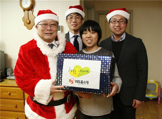 ▲도상철 NS홈쇼핑 대표(사진 왼쪽)와 임직원들이 성탄을 앞두고 7일 백혈병 치료비 후원 등으로 인연을 맺어왔던 어린이와 청소년에게 크리스마스 선물을 전달하는 사랑의 산타 행사를 가졌다.