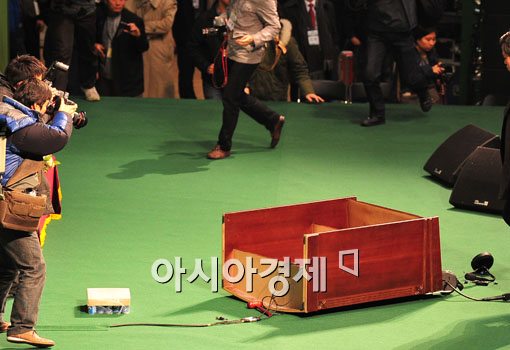 [아시아경제 윤동주 기자] 11일 서울 송파구 잠실실내체육관에서 열린 야권 통합결의를 위한 민주당 전국대의원대회에서 의결 정족수 부족 논란으로 개표가 지연되자 통합에 반대하는 한 민주당원이 의장석 단상을 발로 차 넘어져 있다.윤동주 기자 doso7@<ⓒ세계를 보는 창 경제를 보는 눈, 아시아경제(www.asiae.co.kr) 무단전재 배포금지>