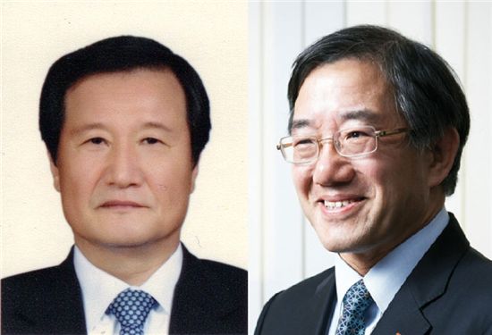(왼쪽부터) 윤증현 전 기획재정부 장관과 송호근 YG-1 대표.