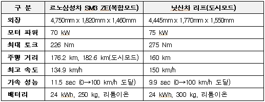▲ 전기자동차 SM3과 RAY의 주요 제원 비교