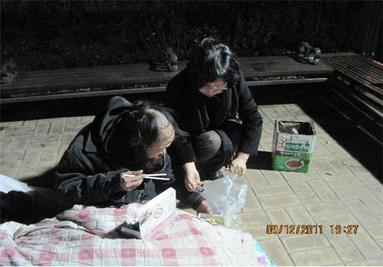 노숙인에게 음식을 전하며 시설 입소를 설득하는 성동구 거리상담반원.