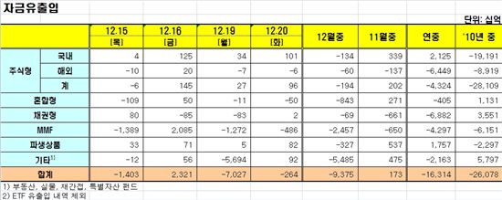 [아시아경제 김유리 기자]국내주식형펀드가 7거래일째 순유입을 기록했다. 해외주식형펀드에서도 이틀째 자금이 빠졌다. 22일 금융투자협회에 따르면 지난 20일 기준으로 상장지수펀드(ETF)를 제외한 국내주식형펀드에 1010억원이 순유입됐다. 해외주식형펀드는 60억원이 줄었다. 채권형펀드에는 20억원이 들어왔고 머니마켓펀드(MMF)에서는 4860억원이 나갔다.전체 주식형펀드의 설정액은 전일대비 790억원 늘어난 103조9460억원을 나타냈다. 국내주식형펀드에 910억원이 들어오고 해외주식형펀드에서 120억원이 빠진 결과다. 설정액과 운용수익을 합한 주식형펀드의 순자산 총액은 전일보다 2850억원 증가한 85조2400억원으로 집계됐다.채권형 펀드와 머니마켓펀드(MMF) 등을 합한 전체 펀드 설정액은 전일보다 2200억원 줄어든 309조9730억원이었고 전체 펀드의 순자산 총액은 1150억원 증가한 286조5090억원이다.