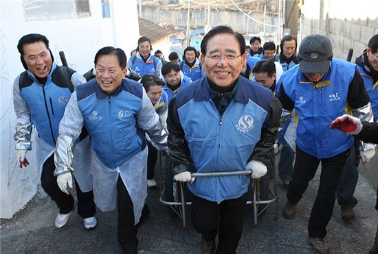 ▲한동우 신한금융지주 회장(왼쪽 세번째)과 서진원 신한은행장(왼쪽 두번째) 등 임직원들이 연탄을 나르고 있다.