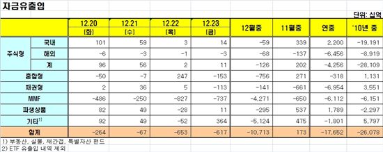 [아시아경제 김유리 기자]국내주식형펀드가 10거래일째 순유입을 기록했다. 해외주식형펀드에서는 닷새째 자금이 빠졌다. 27일 금융투자협회에 따르면 지난 23일 기준으로 상장지수펀드(ETF)를 제외한 국내주식형펀드에 140억원이 순유입됐다. 해외주식형펀드는 30억원이 줄었다. 채권형펀드에서는 1130억원이 나갔고 머니마켓펀드(MMF)에서는 7370억원이 빠졌다.전체 주식형펀드의 설정액은 전일대비 910억원 늘어난 104조1800억원을 나타냈다. 국내주식형펀드에 930억원이 들어오고 해외주식형펀드에서 20억원이 나간 결과다. 설정액과 운용수익을 합한 주식형펀드의 순자산 총액은 전일보다 8610억원 증가한 88조1600억원으로 집계됐다.채권형 펀드와 머니마켓펀드(MMF) 등을 합한 전체 펀드 설정액은 전일보다 5500억원 줄어든 308조9090억원이었고 전체 펀드의 순자산 총액은 4660억원 증가한 289조200억원이다.