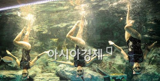 [아시아경제 양지웅 기자] 27일 오전 서울 여의도 63 씨월드 대형수조 안에서 싱크로나이즈드스위밍 국가대표 출신의 연기자들이 '스노우 캣츠' 수중 댄스쇼를 선보이고 있다.양지웅 기자 yangdoo@<ⓒ세계를 보는 창 경제를 보는 눈, 아시아경제(www.asiae.co.kr) 무단전재 배포금지>
