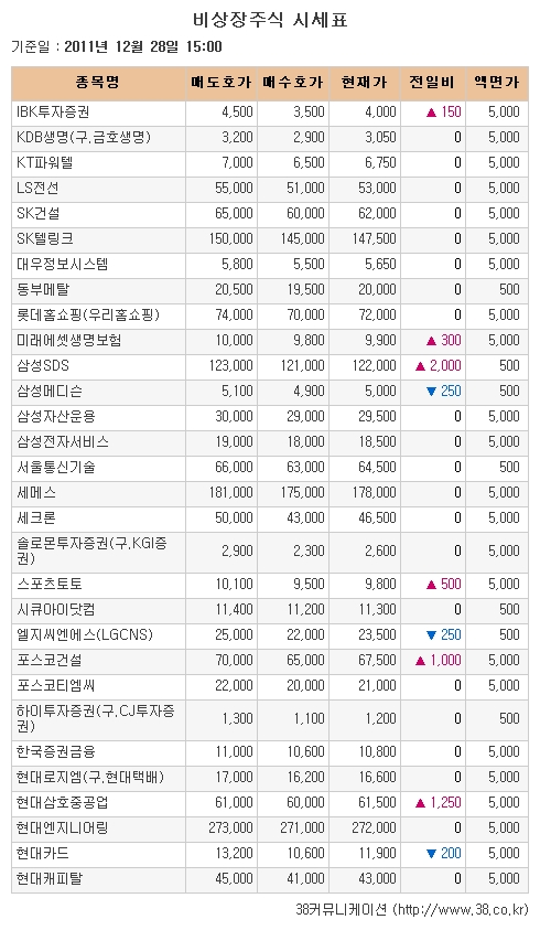 [아시아경제 천우진 기자] 28일 장외주식 시장은 엿새 동안 상승랠리가 이어졌다.기업공개(IPO) 관련주로 다음달 16일 공모 청약 예정인 터보엔진 모터전문 기업 뉴로스가 1만1400원(+5.56%)으로 4거래일 연속 올랐다. 상장심사 청구 기업인 반도체 테스트업체 테스나는 1만원(+5.26%)으로 사흘 연속 올랐다.삼성 관련주로는 초음파 진단기 전문기업 삼성메디슨이 5000원(-4.76%)으로 이틀 연속 하락했다. 정보통신기술(ICT) 서비스기업 삼성SDS는 12만2000원(+1.67%)으로 6거래일 동안 상승세를 이어가며 5주 최고가를 기록했다.범 현대 계열 관련주로는 전업 카드사 현대카드가 1만1900원(-1.65%)으로 7거래일 만에 다시 내려 연중 최저가를 경신했다. 현대중공업 조선 자회사 현대삼호중공업은 6만1500원(+2.07%)으로 이틀 연속 5주 최고가를 지속했다.건설 관련주로는 포스코건설과 SK건설이 각각 6만7500원(+1.50%), 6만2500원(+0.81%)으로 둘 다 5주 최고가를 재경신했다. 금융 관련주로는 생명보험사 미래에셋생명과 증권사 IBK투자증권이 각각 9900원(+3.13%), 4000원(+3.90%)으로 올랐고 미래에셋생명이 7거래일 동안 상승세를 이어갔다.통신 관련주로는 방송 통신기기 제조업체 SK텔레시스와 이동통신 단말기 제조업체 팬택이 각각 2000원(+2.56%), 344원(+2.08%)으로 올랐다. KT파워텔, 포앤티 등은 시세 변동이 없었다.그밖에 시스템통합(SI) 업체 엘지씨엔에스가 2만3500원(-1.05%)으로 내렸다. 체육복표 발행사업자 스포츠토토와 전기 변환장치 제조업체 시그넷시스템은 각각 9800원(+5.38%), 2600원(+4.00%)으로 상승하며 장을 마감했다.자료제공: