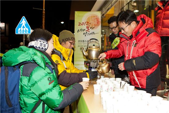 [아시아경제 박소연 기자]코오롱스포츠는 1일 북한산 도봉산 등 국내 유명 10여개 산에서 고객과 함께 하는 '희망나눔' 행사를 진행했다.박동문 코오롱인더스트리 대표는 우이동 코오롱스포츠 매장에서 코오롱스포츠 임직원들과 함께 해맞이를 위해 산을 오르는 고객들에게 따뜻한 차를 건네는 등 새해 인사를 전했다.박소연 기자 muse@<ⓒ세계를 보는 창 경제를 보는 눈, 아시아경제(www.asiae.co.kr) 무단전재 배포금지>