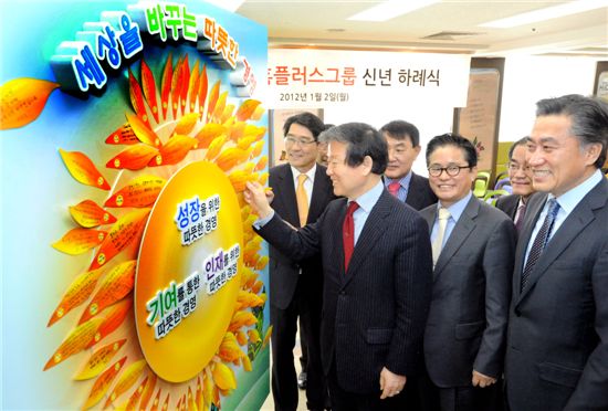 [아시아경제 이윤재 기자] 이승한 홈플러스그룹 회장(왼쪽 두번째)이 2일 역삼동 사옥에서 열린 ‘2012년 홈플러스그룹 시무식’에서 성장과 더불어 사회적 역할을 다하는 ‘새로운 기업 생태계’(New Eco Circle of Business)를 준비하기 위한 경영방침으로 ‘세상을 바꾸는 따뜻한 경영’을 제시했다. 사진은 '세상을 바꾸는 따뜻한 경영'이라는 경영방침을 형상화한 보드판에 임직원들과 함께 새해 소망과 ‘따뜻한 경영’ 실천에 대한 다짐을 적은 쪽지를 붙이고 있는 모습.이윤재 기자 gal-run@<ⓒ세계를 보는 창 경제를 보는 눈, 아시아경제(www.asiae.co.kr) 무단전재 배포금지>