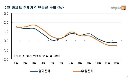 [아시아경제 배경환 기자] 수원 일대 아파트 전셋값이 시세밑으로 떨어지고 있다. 인근 광교신도시와 권선지구의 새 아파트 입주로 가격을 낮춘 아파트 매물이 나오고 있는 것이다.3일 부동산정보업체 부동산114에 따르면 수원 지역 아파트 전셋값은 지난 11월부터 하락세가 이어지고 있다. 12월에는 한 달간 0.51% 떨어지며 낙폭이 더욱 커졌다. 경기도 전체 평균 전세 하락률과 비교해서도 큰 하락세다.원인은 광교신도시의 새 아파트 입주와 권선지구의 재건축 대단지 집들이의 결과다. 수도권 전세시장이 계절상 이른 비수기에 접어든 가운데 대규모 새 아파트 입주가 집중된 탓에 인근 전세수요가 줄고 가격 조정까지 나타난 것이다.용인시 상현동에 위치한 S공인은 “최근 수요자들이 광교로 눈을 돌려 전세가격이 조정된 매물이 나오고 있다”고 전했다. 만현마을 6-7단지의 경우 광교신도시 새 아파트 입주로 한 달새 전셋값이 500만원 가량 하락했다.집들이를 시작한 새 아파트에서도 비슷한 시기에 새 아파트 전세 물량까지 등장하면서 저렴한 물건이 눈에 띄고 있다. 지난 9월 중순 입주를 시작한 1700가구 규모의 권선자이e편한세상은 비수기까지 겹쳐 전세를 찾는 수요가 크게 줄었다. 연말 기준 약 75~80% 정도 입주가 진행됐지만 광교신도시에 약 1만가구 이상의 새 아파트가 추가로 공급될 예정인 탓에 임차인 확보가 쉽지 않다. 82B㎡형의 연말 기준 전셋값은 1억7000만~1억9000만원선으로 9월 입주 초기보다 1500만원 정도 낮아졌다.매매시장은 더욱 한산하다. 지난 2008년 11월 입주한 권선 SK뷰는 최근 수원에 쏟아진 입주물량으로 인해 매물 찾는 문의는 더욱 줄었다. 인근 D중개업소 관계자는 “최근 권선지구 I’PARK CITY가 입주를 시작하면서 간간히 이어졌던 전세문의도 자취를 감췄다”며 침체된 거래 동향을 전했다.수원 율전동에 위치한 서희스타힐스3단지도 상황은 마찬가지다. 수요자들의 선호도가 높은 중소형 아파트인데 비해 거래시장은 썰렁하다. 인근 Y중개업소 대표는 “경기 침체 영향도 있지만 방학시즌이 다가오는 이 시점에 시장이 이렇게 조용했던 적은 처음이다”며 “광교신도시 입주로 인해 매매, 전세 물건을 찾는 수요자들의 움직임이 뜸하다”고 말했다.김민영 부동산114 연구원은 “지난 2011년 가을부터 올 2012년까지 입주를 앞둔 수원과 광교신도시 입주물량만 1만가구가 넘어 저렴한 전세물건이 출시될 가능성이 높다”며 “주변 아파트도 수급불균형 여파로 가격 조정이 나타날 수 있고 수요 위축이 지속되면 가격 약세가 길어질 우려가 있다”고 내다봤다. 반면 실수요자 입장에서는 시세보다 저평가된 새 아파트 매물이나 전셋집을 구할 수 있는 기회가 될 것으로 보인다. 김 연구원은 “수원 일대 기존 아파트는 물론 입주를 시작하는 광교신도시 단지들도 신도시 인프라가 안정되기 전까지는 시세보다 조정된 물건이 나올 가능성이 많다”고 말했다.