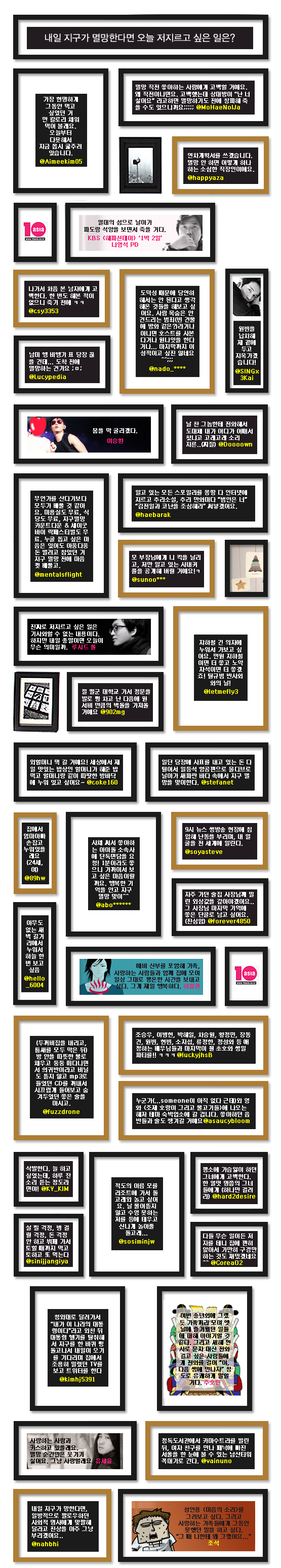 <div class="blockquote">“내일 종말이면 오늘이 무슨 의미일까.” 내일 지구가 종말을 맞는다면 오늘 꼭 저지르고 싶은 일이 있는지 대해 묻자 뮤지션 루시드 폴은 반문했다. 맞다. 누군가는 “한 그루의 사과나무를 심겠다”고 했지만 오늘 이룬 무엇도 내일이면 사라지고 나 자신은 물론 그 기억을 공유할 모든 이들이 함께 세상과 작별할 것을 알고 있다면 어차피 오늘은 허무한 시간일 뿐이다. 그러나 모든 것의 끝을 앞두고 있을 때 우리에게는 ‘마지막 기회’라는 유일한 순간이 찾아온다. 내 삶이 어느 날 갑자기 끝나버릴 수도 있다는 사실을 잊고 살 때는 미처 욕심내거나 엄두내지 못했던 일들이 지구 종말이라는 배수진 앞에서는 가능할지 모른다는 희망이다. 그래서 <10 아시아>에서는 트위터를 통해 던진 질문, “내일 지구가 멸망한다면 오늘 저지르고 싶은 일은?”에 대한 답변 중 일부를 모아 보았다. 그리고 궁금했던 몇몇 사람들에게는 직접 물었다. 마지막 순간을 앞두고 우리가 꿈꾸는 것은 조금씩 비슷할 수도, 서로 너무나 다를 수도 있다. 그런데 중요한 것은, 내일 지구가 종말을 맞는다는 보장이 없더라도 ‘지금’ 해볼 만한 일들이 적지 않다는 점이다. 평소보다 조금 더 많은 용기를 내고 조금만 더 여유를 갖자. 묻어두기엔 아까운 욕망을 찬찬히 들여다보자. 저지를 수 있는, 저질러도 되는 것들은 한 번 저질러보자. 지구 전체가 끝장나지 않더라도, 미처 예측하지 못한 어느 순간 삶이 끝나 버리면 나의 지구는 거기서 끝이니까.