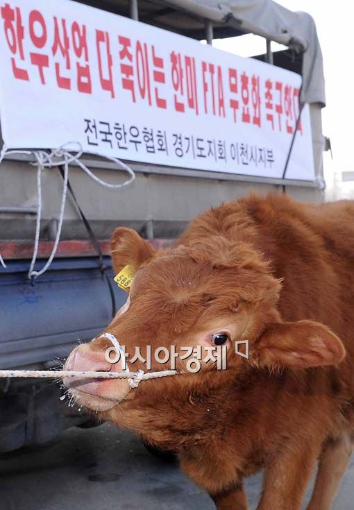 [아시아경제 양지웅 기자] 전국 축산농가들이 수천마리의 소를 이끌고 청와대 앞에서 항의 집회를 예정한 5일 경기 광주 곤지암 IC 근처의 한 주차장에 소가 끌려가고 있다.양지웅 기자 yangdoo@<ⓒ세계를 보는 창 경제를 보는 눈, 아시아경제(www.asiae.co.kr) 무단전재 배포금지>