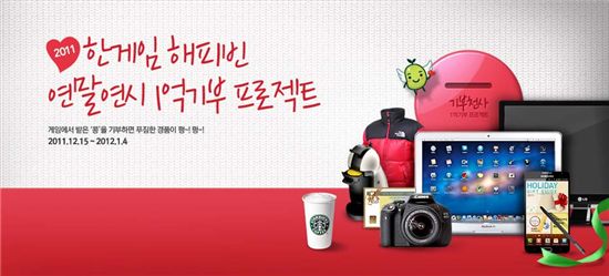 [아시아경제 김철현 기자]NHN(대표 김상헌)은 국내 최대 게임포털 한게임에서 '해피빈 기부천사 캠페인'을 진행해 21일 만에 65만 명이 참여, 1억원을 모금했다고 5일 밝혔다.지난해 12월 15일부터 실시된 이번 캠페인은 사용자들이 한게임 내의 20여개의 게임에서 플레이를 통해 '콩'을 모아 기부하면 1개당 10원을 적립해 사회복지단체에 기부를 하는 방식으로 진행됐다.이번에 모금한 1억원은 노인, 아동, 장애인, 난민, 환경 등 5가지 분야에서 30여개의 사회공헌 단체를 통해 기부될 예정이다. NHN의 조한상 실장은 "올해도 한게임 해피빈을 통해 사용자들과 나눔의 행복을 키워나갈 수 있도록 노력하겠다"고 말했다.김철현 기자 kch@<ⓒ세계를 보는 창 경제를 보는 눈, 아시아경제(www.asiae.co.kr) 무단전재 배포금지>