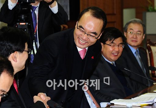 [아시아경제 윤동주 기자] 6일 서울 세종로 정부종합청사에서 열린 국가정책조정회의에 참석한 박재완 기획재정부 장관이 참석자들과 인사를 나누고 있다.윤동주 기자 doso7@<ⓒ세계를 보는 창 경제를 보는 눈, 아시아경제(www.asiae.co.kr) 무단전재 배포금지>