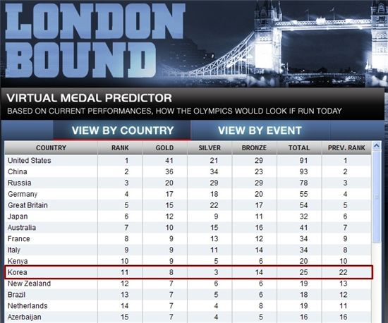 [스포츠투데이 조범자 기자]한국이 2012 런던올림픽서 금메달 8개로 종합 11위에 오를 것이라는 해외 언론의 전망이 나왔다.호주의 헤럴드 선은 매달 초 업데이트하는 런던올림픽 메달 예상 순위표에서 2012년 1월 초 순위에서 한국을 종합 11위에 올려놓았다. 이 매체는 한국이 금메달 8개, 은메달 3개, 동메달 14개를 획득할 것으로 예상했다. 특히 지난달 순위 22위에서 11위로 순위가 급상승해 눈길을 끌었다.헤럴드 선은 현재 종목별로 진행되고 있는 세계선수권 등 국제대회 성적을 토대로 '지금 당장 올림픽이 열릴 경우' 예상되는 종합 순위표를 매달 초 새롭게 업데이트한다.이 메달 예상표에 의하면 미국과 중국, 러시아가 지난달에 이어 1,2,3위를 유지하고 있고 개최국 영국은 5위, 일본은 6위에 랭크되어 있다.한국의 금메달 8개 주인공으로 남녀 양궁 단체전, 배드민턴 남자복식, 유도 남자 73kg급의 왕기춘과 남자 81kg급의 김재범, 사격 남자 10m 공기권총의 진종오, 수영 남자 자유형 400m의 박태환, 그리고 태권도 남자 80kg 초과급의 차동민을 예상했다. 2008 베이징올림픽에서 역대 최다인 금메달 13개로 종합 7위에 올랐던 한국은 2012 런던올림픽서는 금메달 13개로 2004 아테네, 2008 베이징올림픽에 이어 3회 연속 '톱10' 달성 목표를 세웠다.스포츠투데이 조범자 기자 anju1015@<ⓒ아시아경제 & 재밌는 뉴스, 즐거운 하루 "스포츠투데이(stoo.com)">조범자 기자 anju1015@<ⓒ아시아 대표 석간 '아시아경제' (www.newsva.co.kr) 무단전재 배포금지>