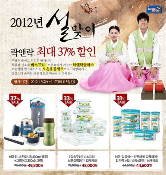 [아시아경제 이승종 기자] 락앤락(대표 김준일)은 오는 17일까지 락앤락몰을 비롯한 온라인 쇼핑몰에서 자사의 제품을 최대 37%까지 저렴하게 판매하는 할인행사를 실시한다고 9일 밝혔다. 대상 제품은 비스프리 테이블탑 12개 세트, 냉동실 전용용기 멀티락 14개 세트, 동절기 필수품 보온도시락보온병 세트 등 58가지 설맞이 기획세트다. 락앤락 관계자는 "15%에서 최대 37%까지 저렴하게 만나볼 수 있다"며 "남은 설 음식을 나누고 보관하는데 유용하게 사용할 수 있을 것"이라고 말했다. 이승종 기자 hanarum@<ⓒ세계를 보는 창 경제를 보는 눈, 아시아경제(www.asiae.co.kr) 무단전재 배포금지>