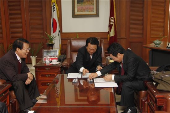 MOU를 체결하는 김자장 태평직물 대표, 노희찬 섬산련 회장, 고경찬 벤텍스 대표이사(왼쪽부터)