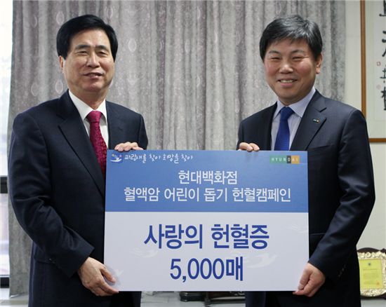 [아시아경제 이초희 기자]현대백화점 하병호 사장은(오른쪽) 9일 헌혈증 5000매를 (사)한국혈액암협회 고흥길 회장에게 전달했다. 이 헌혈증은 작년 하반기 현대백화점 직원과 고객 약 5000명이 참여한 헌혈 캠페인을 통해 기증받은 것이다.현대백화점은 2004년부터 나눔의 문화실천을 위해 임직원과 고객들을 대상으로 헌혈캠페인을 벌여왔으며, 지금까지 약 5만매의 헌혈증을 기증했다. 현대백화점이 기증한 헌혈증은 혈액암 및 소아암 치료를 받고 있는 어린이들을 위해 사용돼 왔다. 이초희 기자 cho77love@<ⓒ세계를 보는 창 경제를 보는 눈, 아시아경제(www.asiae.co.kr) 무단전재 배포금지>