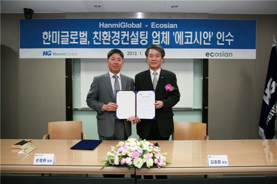 ▲김종훈 한미글로벌 회장(오른쪽)과 은종환 에코시안 대표가 주식 및 경영권 양수 계약을 체결한 후 기념촬영을 하고있다.