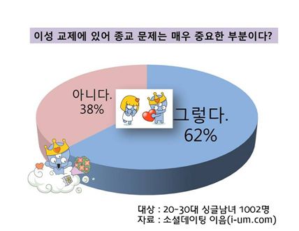 최근 한 TV프로그램에 출연한 유명 여자연예인이 유년시절 첫사랑이었던 교회오빠를 떠올리며 눈물을 펑펑 흘려 화제가 됐다. 연애가 자유롭지 못한 학창시절에는 교회, 성당 등에서 이성을 만날 기회가 잦은 게 사실. 연애를 보다 자유롭게 할 수 있는 20~30대 싱글남녀들은 종교와 이성교제에 대해 어떻게 생각할까.소셜데이팅 이음이 20~30대 성인 남녀 1002명을 대상으로 '이성 교제와 결혼에 있어 종교문제는 중요할까'에 대해 조사한 결과 전체 응답자 중 10명 중 6명(62%)이 '그렇다'고 답했다. '소개팅 첫 만남 시 상대방의 종교에 대해 묻는 편인가?'라는 질문에는 여성의 41%와 남성의 42%가 '그렇다'고 답해 싱글남녀 10명 중 4명은 이성과 첫 만남 시에 상대방의 종교에 대해 물어보는 것으로 나타났다.