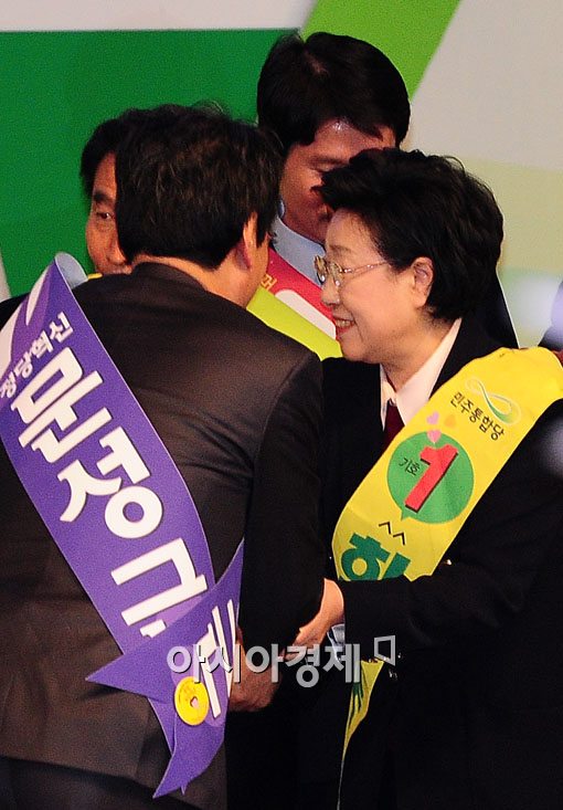 [아시아경제 윤동주 기자] 15일 일산 킨텍스에서 열린 민주통합당 당대표 및 최고위원 선출대회에서 당 대표로 선출된 한명숙 후보가 문성근 신임 최고위원과 기쁨을 나누고 있다.윤동주 기자 doso7@<ⓒ세계를 보는 창 경제를 보는 눈, 아시아경제(www.asiae.co.kr) 무단전재 배포금지>