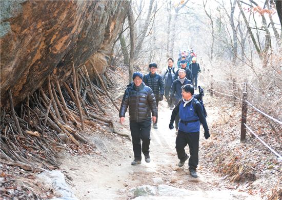 최광식 문화체육관광부 장관이 15일 서울 성북구 북한산을 오르고 있다. 그는 이날 "등산을 할 때 제일 좋은 건 고비를 넘기며 얻는 성취감"이라면서 "올 한 해 많은 고비가 있겠지만 '한류'에 대한 고민 만큼은 놓지 않겠다"고 말했다.