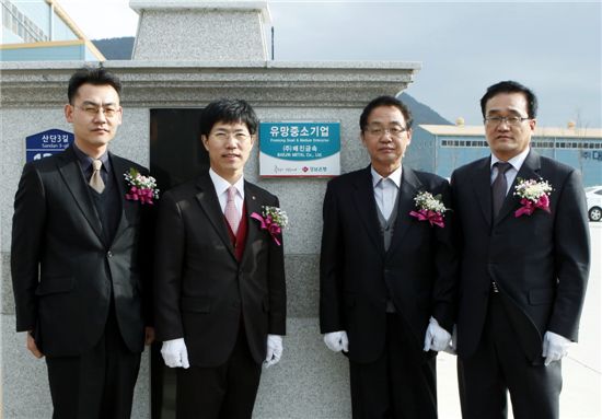 ▲16일 창원시 마산합포구에 있는 배진금속에서 가진 유망중소기업 현판식에서 김창국 경남은행 본부장(왼쪽 두번째)이 조원정 배진금속 대표(왼쪽 세번째) 등 관계자들과 함께 기념촬영하고 있다.