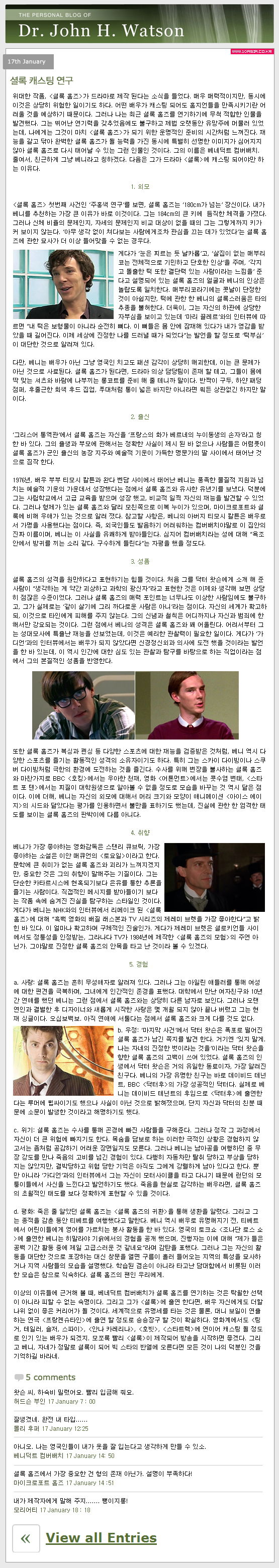<div class="blockquote">불멸의 캐릭터는 단지 기억되는 것에 그치지 않는다. 드라마로, 영화로, 뮤지컬과 만화로 끊임없이 재해석되는 셜록 홈즈는 매번 새롭게 태어남으로써 그 원형을 계속해서 상기시키는 희대의 캐릭터다. 그런 까닭에 셜록 홈즈가 되는 일은 원전의 셜록 홈즈를 비롯해 무수히 많은 비교대상 사이로 몸을 던지는 일이다. BBC의 <셜록>은 그래서 영리한 시리즈다. 작품의 배경에 리얼한 현대의 풍경을 삽입하는 동시에 최대한 훼손되지 않은 셜록을 구축함으로써 드라마는 시대와 인물이 빚어내는 시너지를 획득할 수 있게 되었다. 그리고 이 실험이 가능할 수 있었던 데에는 절묘한 캐스팅이 한 몫을 했다. 특히 제작진이 다른 후보군을 생각조차하지 않았던 것으로 알려진 버네딕트 컴버배치는 2000년 이후 최고의 셜록 홈즈로 평가받고 있다. 다음은 드라마 <셜록>이 제작되기 전 작성된 것으로 추정되는 어느 블로거의 포스팅이다. 아이피를 추적하면 런던 베이커가 221B라는 주소가 나올 것만 같은 아래의 글에 ‘성지순례’ 리플을 달아도 소원은 이루어지지 않으니 실망하지 말자.