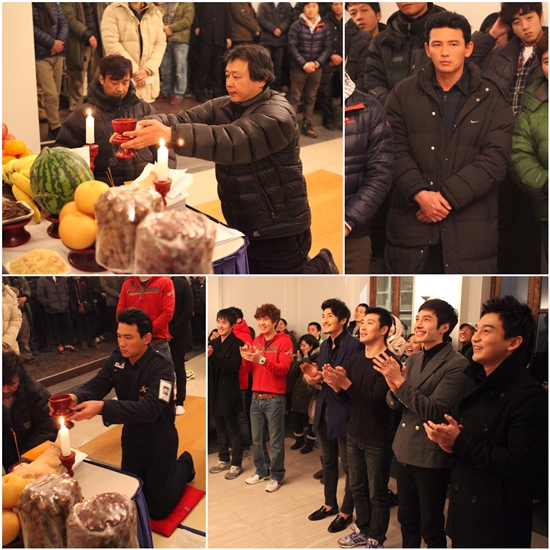 Actor Hwang Jung-min and crew of film "Korean Peninsula" (translated title) hold a good luck ritual in the Gyeonggi Province, South Korea on January 16, 2012. [Y Tree Media]