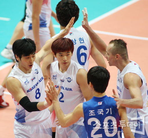 [인천=스포츠투데이 정재훈 기자] 17일 오후 인천 도원체육관에서 열린 'NH 농협 2011-2012 V리그' 남자부 대한항공과 상무신협의 경기에서 득점에 성공한 대한항공 선수들이 기뻐하고 있다.스포츠투데이 정재훈 사진기자 roze@<ⓒ아시아경제 & 재밌는 뉴스, 즐거운 하루 "스포츠투데이(stoo.com)">정재훈 사진기자 roze@<ⓒ아시아 대표 석간 '아시아경제' (www.newsva.co.kr) 무단전재 배포금지>