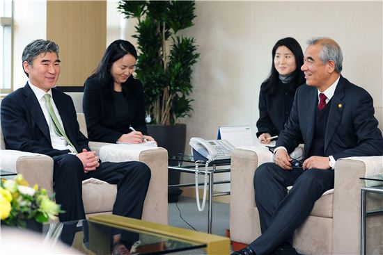 19일 문화체육관광부 청사를 방문한 성 김 주한미국대사(왼쪽)와 최광식 문화부 장관(오른쪽)이 한미 양국간 문화교류 협력방안에 대해 의견을 나누고 있다.