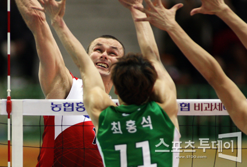 [수원=스포츠투데이 정재훈 기자] 22일 오후 수원실내체육관에서 열린 'NH 농협 2011-2012 V리그' KEPCO와 드림식스의 경기에서 안젤코가 스파이크를 때리고 있다.스포츠투데이 정재훈 사진기자 roze@<ⓒ아시아경제 & 재밌는 뉴스, 즐거운 하루 "스포츠투데이(stoo.com)">정재훈 사진기자 roze@<ⓒ아시아 대표 석간 '아시아경제' (www.newsva.co.kr) 무단전재 배포금지>