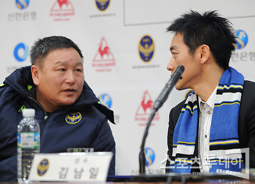 [인천=스포츠투데이 정재훈 기자] 인천 유나이티드에 입단한 김남일과 설기현이 24일 오후 인천시청에서 입단식을 가졌다. 허정무 감독과 김남일이 대화를 나누고 있다.스포츠투데이 정재훈 사진기자 roze@<ⓒ아시아경제 & 재밌는 뉴스, 즐거운 하루 "스포츠투데이(stoo.com)">