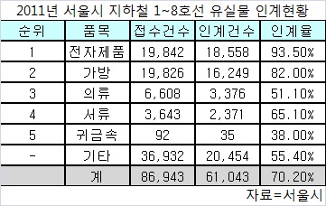 [아시아경제 오진희 기자] 지난해 서울 지하철에서 스마트폰, 노트북과 같은 전자제품이 가장 많이 유실된 것으로 나타났다. 이어 가방, 의류, 서류 순이었다.서울시가 24일 발표한 '지난해 지하철 1~8호선 유실물 통계에 따르면 유실물 1위로 전자제품이 1만9842건, 가방이 16건 적은 1만9826건인 것으로 집계됐다. 전자제품 유실물 접수건수는 지난 2007년(9010건)과 비교하면 두 배 이상 증가한 것이었다.본인 인계율 또한 전자제품과 가방이 각각 93.5%, 82.0%로 높았다. 상대적으로 가격이 낮은 의류의 인계율은 51%로 주인을 찾기 힘든 대표 유실물인 것으로 확인됐다.지난해 유실물이 가장 많이 접수됐던 달은 '7월'로 8715건을 기록했고, 가장 적었던 달은 '2월'로 4719건이 접수됐다.시는 주인을 찾지 못한 물건 중 현금과 귀중품은 1년6개월이 지나면 국가에 귀속시키고, 기타 물품들은 경찰의 승인 하에 사회복지단체 등에 무상양여하고 있다.지하철 이용 중 물건을 분실하면 열차번호와 하차시간, 하차위치 등을 기억해 가까운 지하철역무실이나 지하철 고객센터로 신고하면 된다.서울시 홈페이지 내 대중교통 통합분실물센터는 사진을 비롯한 상세한 습득물 정보를 제공하고 있어 승객들이 분실된 물건이 유실물 센터에 접수됐는지 수시로 확인할 수 있다.유실물센터는 ▲시청역(1·2호선) ▲충무로역(3·4호선) ▲왕십리역(5·8호선) ▲태릉입구역(6·7호선) 등 총 4곳으로 오전 7시부터 오후 10시까지 연장 운영하고 있다.오진희 기자 valere@<ⓒ세계를 보는 창 경제를 보는 눈, 아시아경제(www.asiae.co.kr) 무단전재 배포금지>