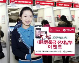 [아시아경제 조목인 기자]경남은행은 등록금을 전자납부하는 대학생들을 대상으로 장학금을 지급하는 '2012년 1학기 대학등록금 전자납부 이벤트'를 실시한다고 25일 밝혔다. 경남과 울산, 부산지역 대학생들이 대상이며 오는 2월말까지 스마트폰과 인터넷, 텔레뱅킹, 모바일뱅킹, 자동화기기(CD/ATM), 가상계좌 등의 전자납부채널과 경남BC신용카드를 이용해 대학등록금을 납부하면 이번 이벤트에 자동적으로 응모하게 된다.납부자 가운데 추첨을 통해 1등(1명)에게 장학금 300만원을 지급하며 2등과 3등(각 1명)에게는 장학금 200만원과 100만원을 준다. 또 150명에게는 5만원 상당의 상품권도 제공한다. 팽영대 경남은행 U뱅킹사업팀장은 "경남은행의 전자납부채널을 통해 대학등록금을 간편하고 안전하게 납부하고 이벤트 당첨의 기쁨도 누리기 바란다"고 말했다. 조목인 기자 cmi0724@<ⓒ세계를 보는 창 경제를 보는 눈, 아시아경제(www.asiae.co.kr) 무단전재 배포금지>
