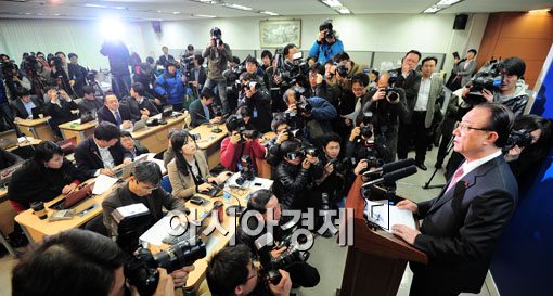 [아시아경제 윤동주 기자] 최시중 방송통신위원장이 27일 서울 광화문 방통위에서 사퇴 기자회견을 갖고 있다.윤동주 기자 doso7@<ⓒ세계를 보는 창 경제를 보는 눈, 아시아경제(www.asiae.co.kr) 무단전재 배포금지>