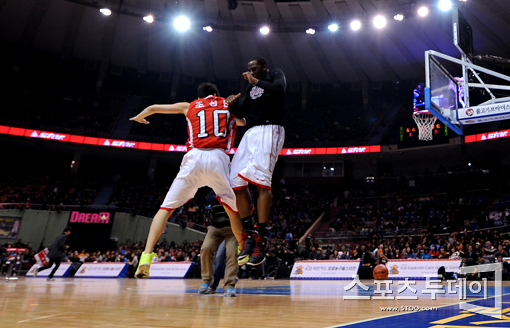 [포토] 덩크슛 성공한 로드 '조성민과 몸통 박치기!
