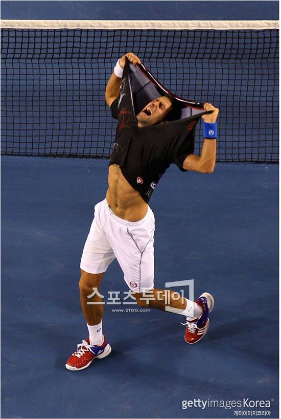 노박 조코비치가 호주오픈 우승을 차지한 후 유니폼을 찢으며 포효하고 있다. [사진=Getty Images/멀티비츠]