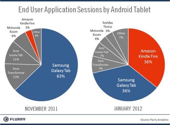 [아시아경제 권해영 기자]삼성전자의 '갤럭시탭'이 아마존의 저가 태블릿PC '킨들파이어'로 고전하고 있다.28일(미국 현지시간) 모바일 분석 및 광고 전문회사인 플러리에 따르면 전체 안드로이드 태블릿PC 판매에서 갤럭시탭이 차지하는 비중이 감소했다.갤럭시탭의 안드로이드 태블릿PC 시장 점유율은 지난 2011년 11월 기준 63%였으나 올해 1월 절반 수준인 36%로 떨어졌다. 같은 기간 킨들파이어는 3%에서 36%로 12배 증가했다.킨들파이어의 성장으로 안드로이드 태블릿PC 업체 대부분은 시장 점유율이 감소했다. 아수스 '트랜스포머'는 13%에서 7%, 에이서 '아이코니아 탭'은 11%에서 7%, 모토로라 '줌'은 6%에서 4%로 줄었다.킨들파이어가 인기를 끄는 것은 199달러(약 22만원)이라는 낮은 가격과 우수한 콘텐츠 경쟁력 덕분이다. 아마존은 킨들파이어 구매자에게 아마존닷컴을 통해 전자책, 음악, 영화, 드라마, 게임 등 다양한 콘텐츠를 이용할 수 있도록 하고 있다. 그 결과 태블릿PC 시장에서 유일하게 애플을 따라잡고 있다. 투자금융회사 모건스탠리에 따르면 킨들파이어는 연말에만 아이패드 판매량을 200만대 가량 잠식한 것으로 추정된다.애플도 다양한 애플리케이션을 갖춘 앱스토어를 통해 직전 분기 1540만대의 아이패드를 판매하며 태블릿PC 시장 확대를 이끌었다.킨들파이어와 아이패드의 판매 호조로 지난해 4분기 태블릿PC 판매량도 크게 늘었다. 시장조사업체 스트래티지 애널리틱스(SA)에 따르면 같은 기간 태블릿PC 출하량은 2680만대로 전년 동기(1070만대) 대비 2배로 성장했다.권해영 기자 roguehy@<ⓒ세계를 보는 창 경제를 보는 눈, 아시아경제(www.asiae.co.kr) 무단전재 배포금지>