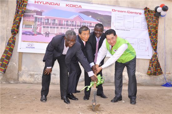 현대자동차는 31일(한국시간) 가나 현지에서 한국국제협력단, 플랜코리아, 현지 정부 관계자들이 참석한 가운데 ‘현대-코이카 드림센터’ 착공식을 개최했다. 사진 왼쪽부터 알렉스 아사모 코포리두아 시장, 견제민 주가나 한국대사, 크와시 아크옘 아피아 쿠비 가나 동부 주지사, 이장호 현대차 아프리카 지역본부장.