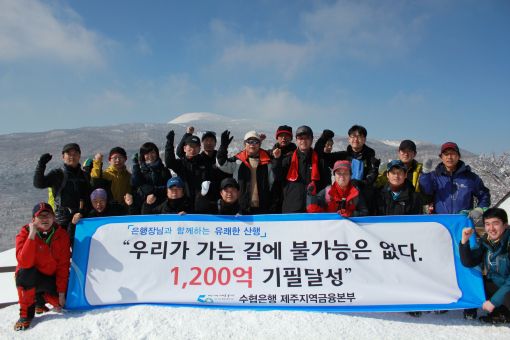 수협은행의 이주형 은행장(가운데)과 임직원들이 제주도 한라산 사라오름에 올라 2012 사업목표인 1160억원을 넘어 1200억원까지 초과달성하겠다는 의지를 되새기며 파이팅을 외치고 있다.