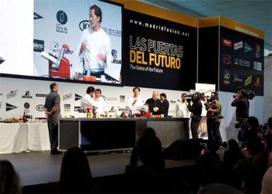 한식세계화 현장을 가다<下> 발효음식 경연[마드리드(스페인) = 고형광 기자] '2012 마드리드 퓨전'의 본 행사는 지난달 24~26일(현지시간) 사흘간 마드리드 학술회의장(Palacio Municipal de Congresos)에서 열렸다. 환영 만찬장에서 차로 20여분 떨어진 곳이다. 세계 음식 트렌드를 실질적으로 이끄는 공간이 바로 이 곳이다. 전 세계의 유명 셰프들이 솜씨를 경연하는 장소이기도 하다. 사흘 내내 방문객들로 북적였다.올해 행사에선 한국 셰프들이 중심에 자리하고 있었다. '마드리드 퓨전' 사무국이 정한 올해의 주제는 '발효음식'. 발효음식이 발달한 한국을 주빈국으로 초청한 만큼 우리나라 셰프들의 경연이 행사기간 내내 이어졌다.그 만큼 한국으로서도 '2012 마드리드 퓨전' 행사는 특별했다. 만찬을 통해 한국 음식을 세계에 알릴 수 있는 기회이기 때문이다.행사 첫날 요리 경연의 포문은 '방랑 식객'으로 널리 알려진 임지호(56) 셰프가 열었다. 그는 2008년 람사르총회 메인 셰프로 활동했으며, 외교통상부장관 표창을 받은 실력파다. 어린 시절 한의학을 공부한 부친의 영향으로 음식이 곧 약이 된다는 '자연요리'를 추구한다. 본인이 국내서 운영하는 한식당 '산당'에서도 이같은 원칙은 적용된다.임 셰프는 이날 '교감'이라는 주제로, 산과 들에서 채집한 나물을 주재료로 사용했다. 여기에 간장 된장 등 우리의 발효음식을 가미해 지층(地層)을 표현했다. 그는 "요리에 우리의 역사성과 철학을 담았다"고 설명했다. 그의 시연이 끝나자 참석자들의 기립 박수가 터져나왔다. 행사 관계자는 "보기 드문 광경"이라고 귀띔했다.둘째날인 25일엔 임정식(34) 세프가 요리 경연에 나섰다. 그는 세계 3대 요리학교 중 하나인 미국의 CIA(The Culinary Institute of America) 출신이다. 백악관 현재 메인 셰프도 CIA를 나왔다. 한식 세계화에 기여하고 있는 떠오르는 별로, 한식과 양식의 식재료와 조리법을 창의적으로 조화시켜 '뉴 코리안' 장르를 개척했다는 평가를 받고 있다.그는 경연장에서 된장찌게를 선보였다. 물론 전통 된장이 아닌 서양식으로 개량된 된장을 사용해 된장 고유의 냄새를 줄였다. 임 셰프는 본인이 운영하는 뉴욕의 '정식당'에선 된장찌게가 인기 요리 중 하나라며, 한식 세계화에 대한 자신감을 내비쳤다.▲ 상훈 드장브르가 '마드리드 퓨전'에 참석해 요리 경연을 펼치고 있다.
