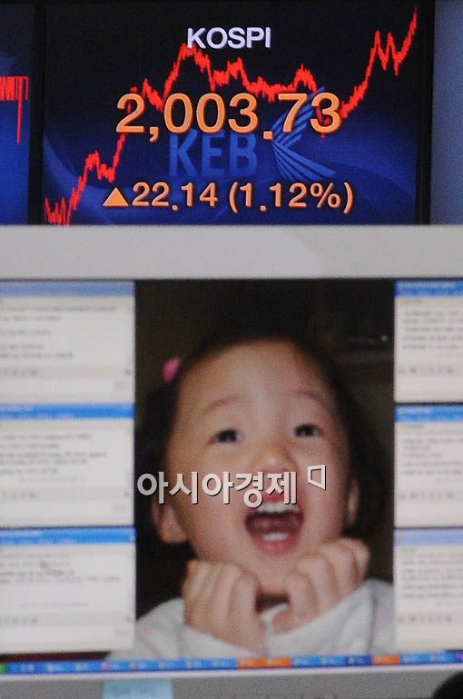 [아시아경제 양지웅 기자] 코스피 지수가 전일 대비 22.14포인트(1.12%) 오른 2003.73에 장을 마친 8일 오후 서울 명동 외환은행 본점 한 직원의 모니터에 딸의 사진이 재밌는 상황을 연출하고 있다.양지웅 기자 yangdoo@<ⓒ세계를 보는 창 경제를 보는 눈, 아시아경제(www.asiae.co.kr) 무단전재 배포금지>