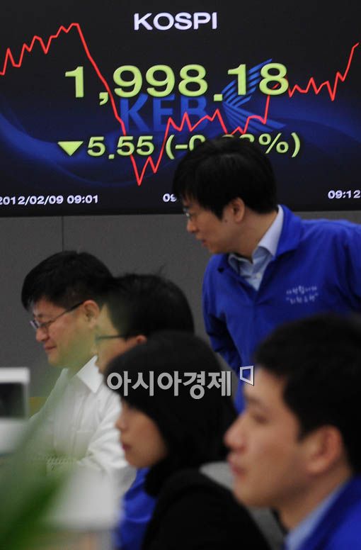 [아시아경제 양지웅 기자] 코스피 지수가 전일 대비 5.53포인트(0.28%) 내린 1998.20에 출발한 9일 오전 서울 명동 외환은행 본점 딜링룸에서 직원들이 분주히 움직이고 있다.양지웅 기자 yangdoo@<ⓒ세계를 보는 창 경제를 보는 눈, 아시아경제(www.asiae.co.kr) 무단전재 배포금지>