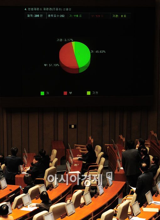 [아시아경제 윤동주 기자] 9일 서울 여의도 국회에서 열린 본회의에서 민주통합당이 추천한 조용환 헌법재판관 후보자 선출안이 부결 되고 있다.윤동주 기자 doso7@<ⓒ세계를 보는 창 경제를 보는 눈, 아시아경제(www.asiae.co.kr) 무단전재 배포금지>