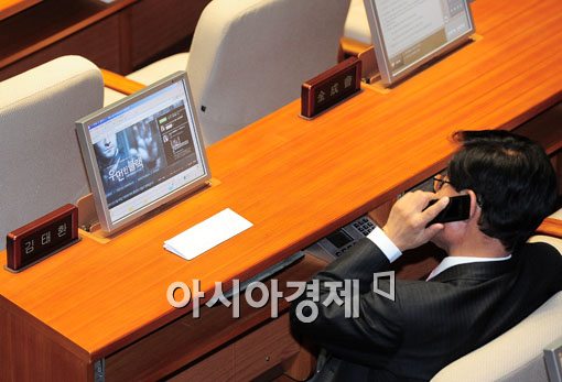 [아시아경제 윤동주 기자] 9일 서울 여의도 국회에서 열린 본회의에서 김태환 새누리당 의원이 영화 관련 사이트를 보면서 전화를 하고 있다.윤동주 기자 doso7@<ⓒ세계를 보는 창 경제를 보는 눈, 아시아경제(www.asiae.co.kr) 무단전재 배포금지>