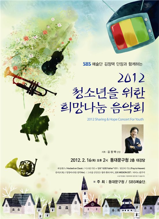 [아시아경제 박종일 기자]봄방학을 맞이한 청소년들을 위해 고품격 희망나눔 음악회가 동대문구청에서 개최된다.동대문구(구청장 유덕열)는 16일 오후 2시부터 동대문구청 2층 강당에서 지역내 아동·청소년 400여명을 대상으로 SBS예술단(김정택 단장)과 함께하는 ‘2012 청소년을 위한 희망나눔 음악회’를 개최한다.이번 음악회는 SBS예술단(김정택 단장)의 재능 기부를 통해 이루어진 뜻 깊은 자리로서 SBS예술단이 음향과 조명 등 무대장치를 직접 설치해 대강당의 넓은 공간에서 실제 음악회를 방불케하는 연주를 들을 수 있게 된다.
