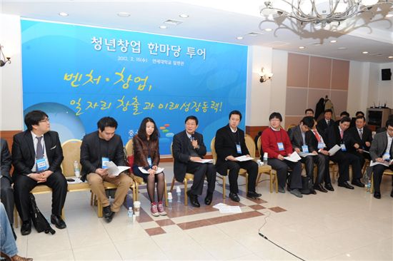 15일 송종호 중소기업청장(왼쪽에서 네번째)은 연세대학교 알렌관에서 청년 창업기업인 및 대학생 예비창업자 50여명과 청년창업 한마당투어를 갖고 2012년 청년창업 지원대책을 설명하고 애로사항을 토론했다. 이승종 기자 hanarum@<ⓒ세계를 보는 창 경제를 보는 눈, 아시아경제(www.asiae.co.kr) 무단전재 배포금지>