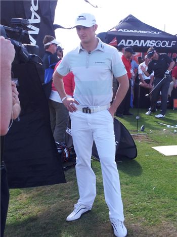 미국 플로리다주 올랜도 'PGA머천다이스쇼' 데모데이에서 장타 시범을 보인 뒤 언론과 인터뷰하고 있는 제이미 새들로스키.<br />